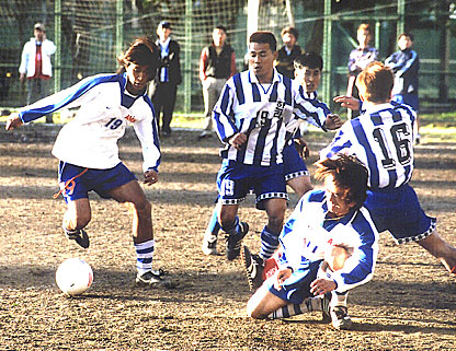| 16チームが参加し、熱戦が繰り広げられた第4回コリアンサッカーフェスティバル(写真は決勝戦、「留学生」対「漢拏」でボールを競り合う両チーム選手) |