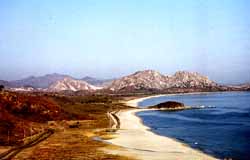 金剛山陸路観光の出発地となる江原道高城郡の 「統一展望台」前の海岸線。前方は北韓の山脈 |