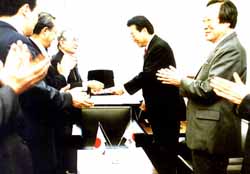 金団長は、募金6400万円の目録を那須会長に手渡した。金団長は「経済状況が思わしくない中だが、これだけ集まりました」と、不況下でも在日韓国人がワールドカップの韓日共催に深い関心を寄せている状況を伝えながら、「日本の地域住民である私たちが、韓日友好の架け橋役になりたい。歴史教科書問題などでぎくしゃくしたが、これを契機に真の韓日友好関係を築いていくことを願っている」と在日同胞の誠意を伝えた。