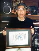 | 「君は天の列車に乗って」の歌詞 を収めた額をもつ下村さん |