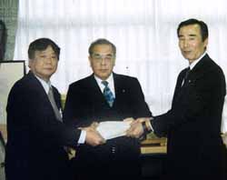 野中園部町長に請願書を手渡す 李民団丹波支部支団長(右)と 姜総連口丹支部委員長(左) |