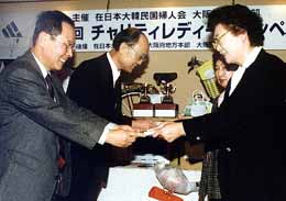 今回は民族学校への支援を目的に開催され、収益と民団大阪府本部(金昌植団長)からの支援金をあわせて、白頭学院(姜駒錫校長)と金剛学園(姜森校長)にそれぞれ50万円ずつ手渡された。