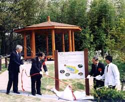 「慶山の森」は敷地面積1200平方b。園内には慶山のシンボルとなっている銀杏、特産の木蓮、杏、棗など慶山市から贈られた苗木118本を植栽、休憩所となる韓国風「四阿(あずまや)」も設置した。総工費は1900万円。