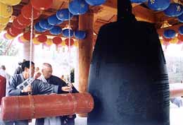 竣工したばかりの鐘閣に収められた梵鐘は青銅製で鐘高2・5メートル、口径約1・8メートル。7日の初打鐘式には近畿を中心に全国から350人の信徒が参加。韓国からも大韓仏教曹渓宗の釋西翁前宗正ら関係者多数がお祝いに駆けつけた。