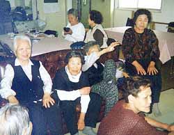同支部1階の事務所を2階に移動して1階を改装、比較的元気に歩いて来訪できる65歳以上のお年寄りを対象に、毎週月・水・金曜日の午前10時から実施している。訪れるお年寄りたちは、婦人会同支部(金静子会長)のオモニたちが作る韓国料理に舌鼓みを打ちながら、韓国ビデオの上映や札遊び、お互いの近況報告など話が尽きることがない。