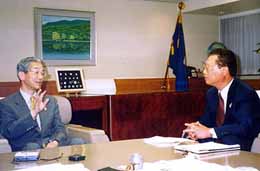 | | 左から石川嘉延静岡県知事・金光敏民団静岡副団長 |
