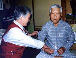 | | 病床の権さんの世話をする崔さん(左) |