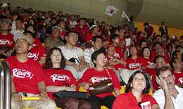 韓国初戦のポーランド戦(6月4日)には民団420人、総連80人の合わせて500人の同胞が韓国サポーターのシンボルである赤いTシャツを着て釜山W杯スタジアムの一角を埋めた。