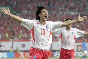 【大田】サッカーの2002FIFAワールドカップ(W杯)韓日大会で初の決勝トーナメント(18強)進出を果たした韓国代表は18日、大田W杯競技場で行われた優勝候補イタリアとの決勝トーナメント1回戦で延長戦の末、2-1で逆転勝利をあげ、ベスト8に進出した。アジア勢の8強入りは66年イングランド大会(16カ国出場)の北韓以来のこと。準々決勝は21日から始まり、韓国は22日に光州W杯競技場でアジア勢初の4強入りをかけて、やはり優勝候補の強豪スペインと対戦する。