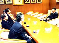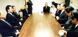 | 与党に法案の成立を働きかける 民団中央本部代表。自民党本部で 山崎拓幹事長と(02年1月8日)。 |