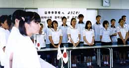 23日に山中中学校を訪れた一行は、同校ブラスバンド部の愛国歌演奏などあたたかい歓迎を受けた。ホームステイ先となる同校生徒16人とお互いはにかみながら自己紹介したあと、図書室では茶道部のもてなしを受け、お茶のたて方に熱心に見入った。