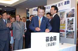 | 「助けあい運動」開始に際し 誠金を募金箱に入れる 許孟道・東京本部団長 |
