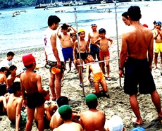 | 今年も全国でオリニのサマーキャンプが企画されている (写真は96年、神奈川のキャンプで海岸で リンボーダンスなどのゲームを楽しむオリニたち) |