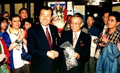 | パリへの出発を前に金浦空港には 2002年W杯組織委員会の朴世直委員長が 共同応援団の激励にかけつけた |