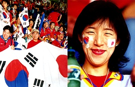 | (左)韓日両国旗を手に熱い声援を送るサポーターたち (右)韓日両国旗をペイントする女性も |