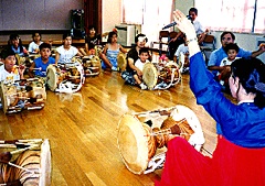今年は「竹とんぼ」「ビデオ」「折り紙」など二十二の「ふれあい教室」ができた。このうち「チャンゴ教室」には六百四十二人の全校児童生徒中、三年生から五年生までの十八人から申し込みがあった。全員、チャンゴに触れるのはこの日が初めて。それでも、在日韓国人の金順玉さん(40)ど(ソウ)和仙(34)さんの指導のもと、わずか二時間で「トラジ」の歌に合わせてチャンゴ伴奏するまでに上達した。