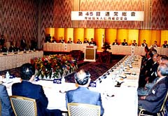 在日韓国人信用組合協会(李煕健会長)の第四十五回通常総会が七月二十四日、大阪市内のホテルで開かれた。「日本版ビッグバン」に伴う民族金融機関の生き残りをかけた全国会員信用組合の統合・再編を最重要課題と位置づけ、(1)ブロック別再編(2)合併事務、再編に関する事務上の情報提供(3)双方向情報システム構築(4)会員組合役員相互の交流(5)会員信組中核実務者の交流―などを展開していくことを決めた。
