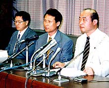 | 判決後の記者会見に望む 尹昌烈さん(中央)と弁護団 |