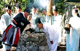 | 全羅北道南原市の蚊龍山山城跡で採火された「窯の火」を 火炉に移す陶工の子孫ら(10月19日午前) |