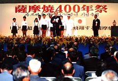 薩摩焼を興した韓国人陶工の渡来四百年を記念した「薩摩焼四百年祭」の幕開けを飾る記念式典と韓国・全羅北道南原市から船で運ばれた「窯の火」の点火式などが二十二日、薩摩焼の里鹿児島県東市来町美山(旧名苗代川)で行われ、一カ月あまりのまつりがスタートした。