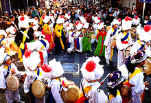 初めに子どもたちだけで構成するプンムルノリ隊、続いて青年たちと、約百店舗が軒を並べるL字型全長六百五十メートルの商店街を練り歩いた。
