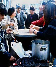 | 民団と青年会では17日、仮説住宅地の 広場で温かいサムゲタンを炊きだし、 同胞や被災者らに提供した |
