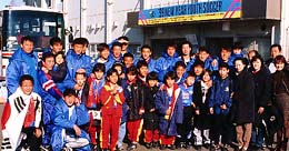 | 試合で使用したユニフォームをプレゼントし、 在日3世たちの少年サッカーチームの子どもたちと 記念写真を撮る韓国ユースU18代表たち (17日、浦和市駒場競技場で) |