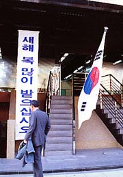 韓国文化院の開院を契機に、屋上のほか御堂筋に面した玄関口にも、四日から特大の太極旗を掲げている。金大中大統領の訪阪で、韓日友好ムードがこれまで以上に高まっていることから実現させた。