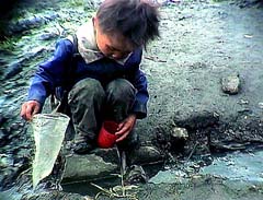 | | 飲めない泥水を飲もうとビニール袋にすくう女児 |
