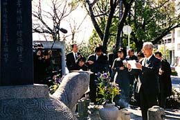 移設委発足式に先立って堺橋西詰めにある慰霊碑前で、平岡市長、ソウ圭泰駐広島総領事、朴義鍾団長をはじめとする民団広島県本部幹部ら多数が参席して移設報告会が行われ、移設許可証を碑前に捧げた。