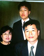 | 両親と難関高校4校突破を喜びあう 金濬河君(中央)と両親 (東京・荒川区の自宅で) |