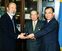 | 韓国から運ばれた火で焼いた 「平成火ばかりを辛容祥民団中央団長 (中央)に贈る沈壽官氏(左)。右は松下次官。 |