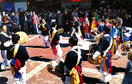 | | 横浜駅前で爽快なサムルノリを演奏する青年会員たち |