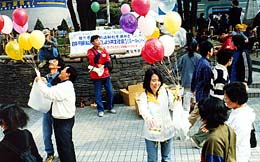 | 風船やビラなどを配布しながら地方参政権を アピールする青年会員ら(4月17日、新宿アルタ前で) |
