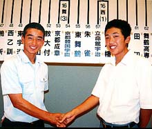 | 初戦の相手、京都成章の三富主将(左) と握手する金存生・京都韓学主将(右) |