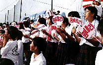 | ガンバレとハングルで書かれた ウチワを持って応援する京都韓学生徒たち |