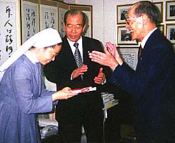 ソウル市内での贈呈式には金会長はじめ三重野会長、民団宮崎県本部の李二洙団長らが参席し、同施設の金修女シスターに基金を手渡した。=写真= 金シスターも「大切に使わせてもらいます」と答礼した。