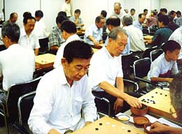 年齢は40歳代から60歳代が中心。中にはハラボジの手に引かれてきたと思われる小学生碁士の姿も。七段から級位者まで実力別に四組に分かれ、午前中から夕方まで終始なごやかに手合わせが進んだ。同大会を主催したのは「アリラン囲碁会」(安禧中会長、東京商銀信組元副理事長)。