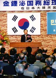 | 民団中央会館で行われた 東日本地区同胞との懇談会で 激励のあいさつを述べる金鍾泌首相 |