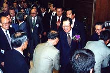 | | 民団幹部ら一人ひとりと握手する金鍾泌首相 |