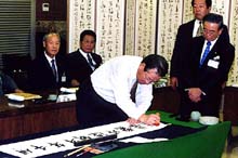 | | 「新たな千年の創造と繁栄」と揮毫する金鍾泌首相 |