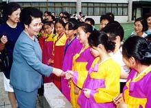 朴女史は同校に到着後、児童会長の金鍾鉉君(小6)と生徒会副会長の廉スッキョンさん(高1)から花束を受け取った後、校庭で民族衣装を着て待ち受けた児童一人ひとりの手を握りながら激励した。