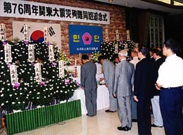 マグニチュード7・9の大激震のさなか、流言卑語に乗じた日本人自警団らによりおびただしい数の同胞が虐殺された関東大震災。76周年を迎えた1日、東京・南麻布の韓国中央会館で「殉難同胞追念式」がしめやかに行われた。