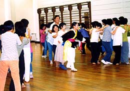 【大阪】秋の体育祭シーズンを前に、大阪市外国人教育研究協議会(大野俊明会長・市立玉津中学校長)は、今年も市内の公立学校教員を対象に「韓国楽器・遊びの実技研修会」を実施した。