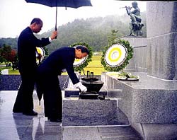 | 雨の中で行われた慰霊祭で 代表の焼香をする辛容祥民団中央本部団長 |