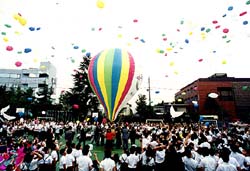 金大中大統領の「平和と希望の轟きが7000万韓民族の胸中に響き渡ることを期待している」とのメッセージ(金大使代読)、辛容祥民団中央本部団長の「未来への希望が広く広く高い空に向かって飛んでほしい」と(金副団長代読)のあいさつにつづいて、参加者と同校児童・生徒が書いたメッセージが気球船に入れられ、約500個の風船とともに飛ばされた(写真)。