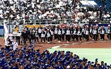 | 開会式で観衆に手を振りながら 元気良く入場行進する 在日同胞選手団 |