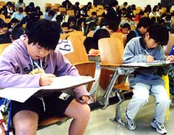 【大阪】日本に千字文(漢字)と論語を伝えた百済の学者・王仁博士にちなんだ「千字文漢字大会」が3日、枚方市の王仁博士の墓にほど近い大阪国際大学で開催された。会場には大阪と京都の民族学校はじめ大阪府内の小中高校生ら300人余りが参加し、千字文から出された問題に取り組んだ。