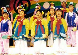 | 民族衣装を着て韓国の童謡などを 合唱する児童 |