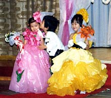 プログラムは韓国語劇やサムルノリ、踊りなどバラエティ豊かな13演目が演じられた。このうちチンダルレ班(3歳児)の「花嫁行列」では、教師手作りのウエディングドレスを身にまとった女の子が男の子のエスコートで舞台に登場した。くるりと回ってポーズを決め、最後は男の子が女の子のほおにキスして会場をわかせた。